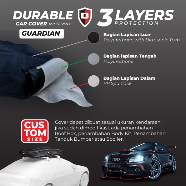 Untuk pemakaian indoor (seperti di dalam garasi atau di bawah carport yang luas), cover 1 lapis seperti Durable Premium atau Durable Defender biasa sudah cukup karena hujan dan panas sudah ditangkis oleh dinding dan atap. Proteksi yang diperlukan adalah untuk berjaga-jaga terhadap baret dari barang di sekitar mobil, proteksi air jika ada atap yang bocor, dan proteksi terhadap cakaran hewan. Karena itu cover 1 lapis saja sudah cukup.